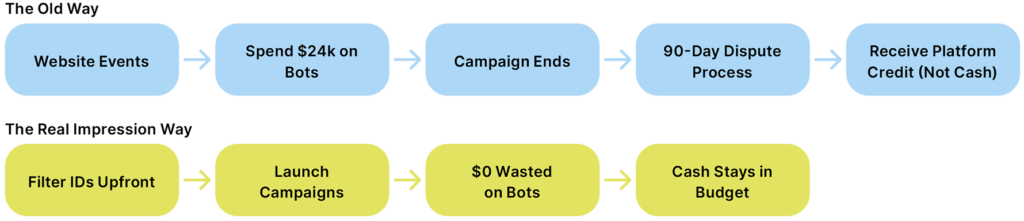 The standard industry safety net relies on DSPs issuing post-spenrefunds for IVT 60 to 90 days after the campaign has run. But for a CTV advertiser, waiting for a refund isn’t money saved—it’s capital held hostage.